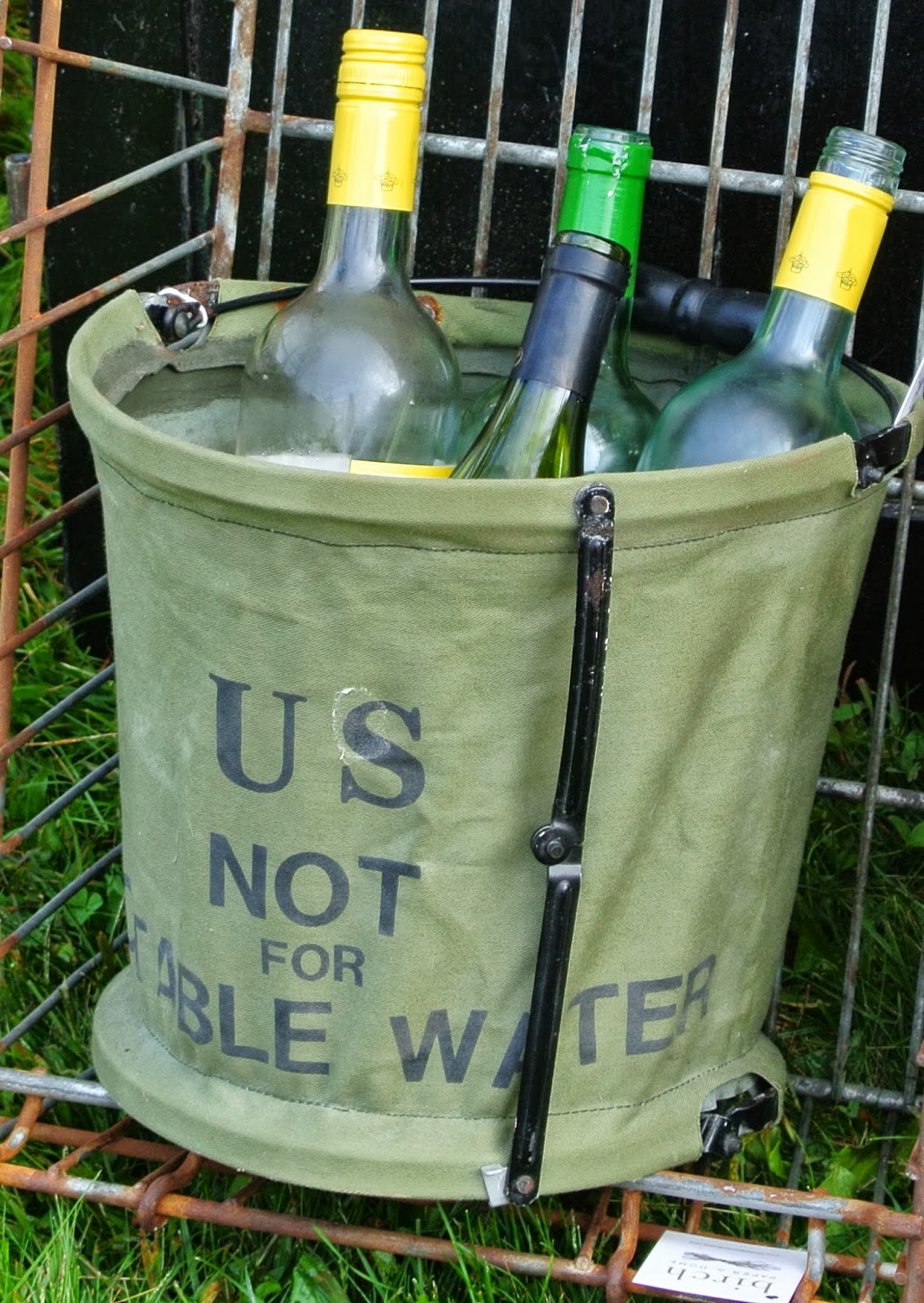 -vintage military collapsible water bucket used as ice bucket for bar;